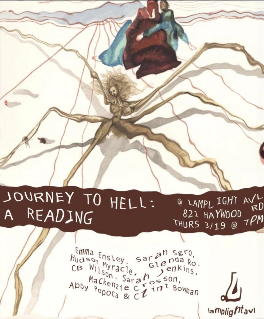 Our current resident Emma Ensley will be hosting a reading on Thursday, 3/19, where she and eight other readers will share work related to Dante’s 9 circles of hell 🔥 Come out at 7pm and hear what Emma has been working on + much more 😊 Emma will read from her novel in progress, and other readers will pull from a variety of sources and genres. We hope to see you!